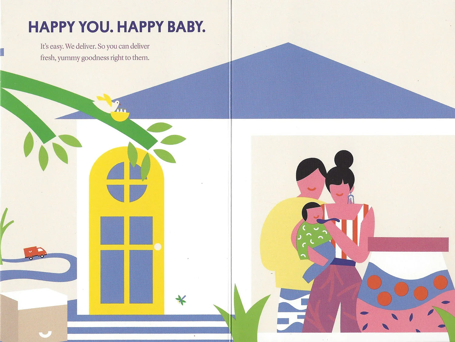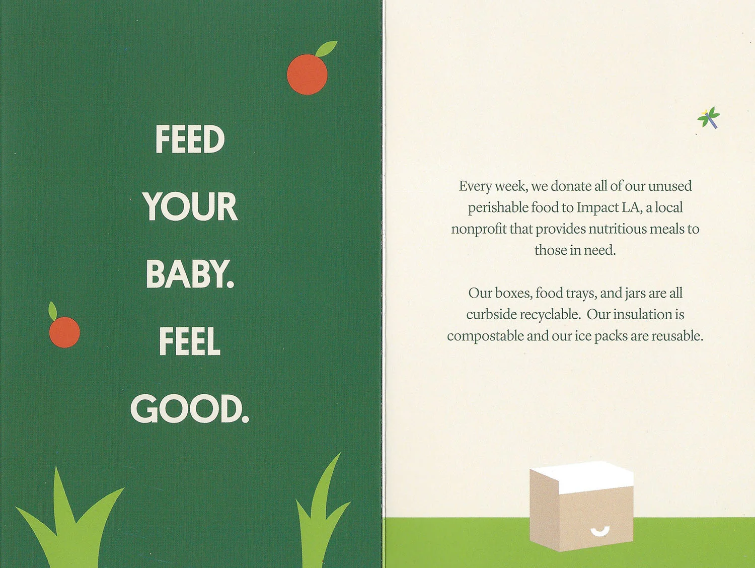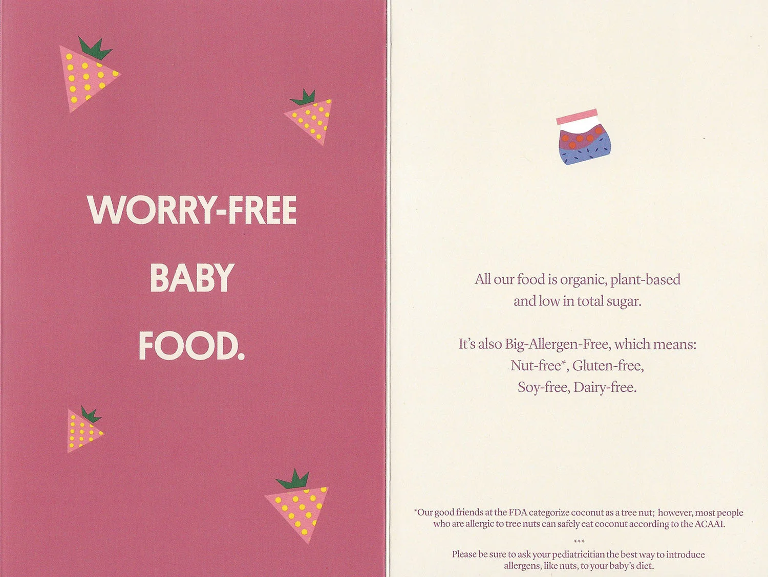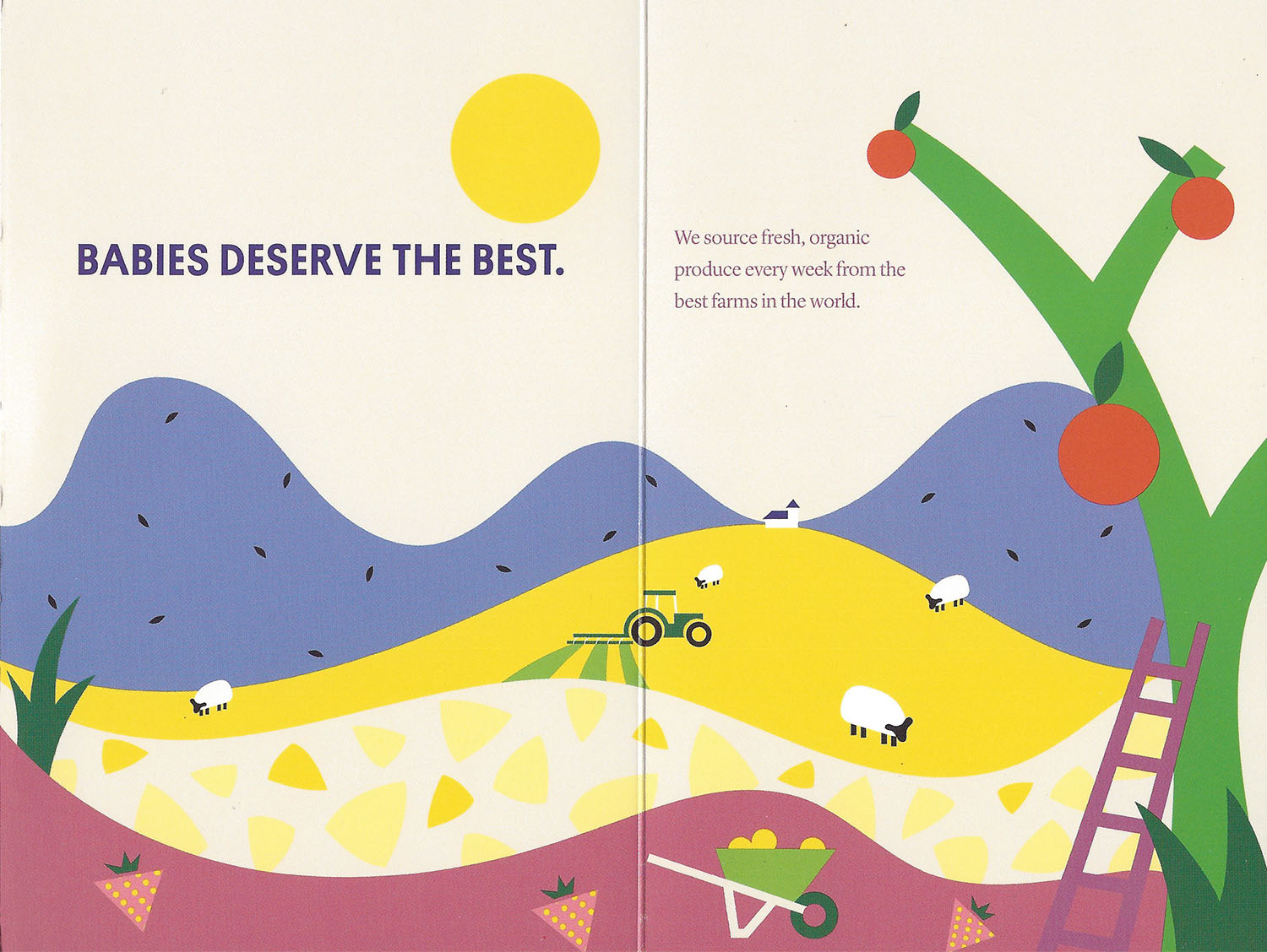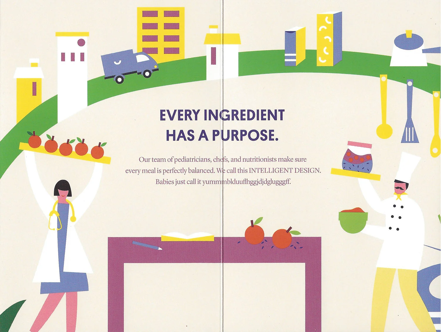 Brochure to illustrate Yumi baby food's "farm to face" concept and icons to illustrate the company's fresh, organic, allergen-free, and nutritious baby food.